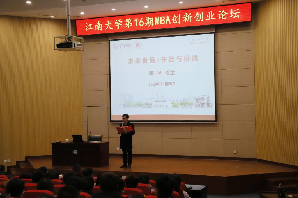 At 18: 00 on December 20, the 16th MBA Innovation and Entrepreneurship Forum was held in the Far East Lecture Hall. Professor Chen Jian, academician of the Chinese Academy of Engineering, director of the National Engineering Laboratory for Cereal Fermentation Technology, and director of the Future Food Science Center of Jiangnan University, gave a lecture on “Future Food: Tasks and Challenges”. Zhang Haifeng, secretary of the Party Committee of the School of Business, Deputy Dean Wang Yuhong and 320 postgraduates participated. The forum was hosted by Teng Lefa, dean of Business School.