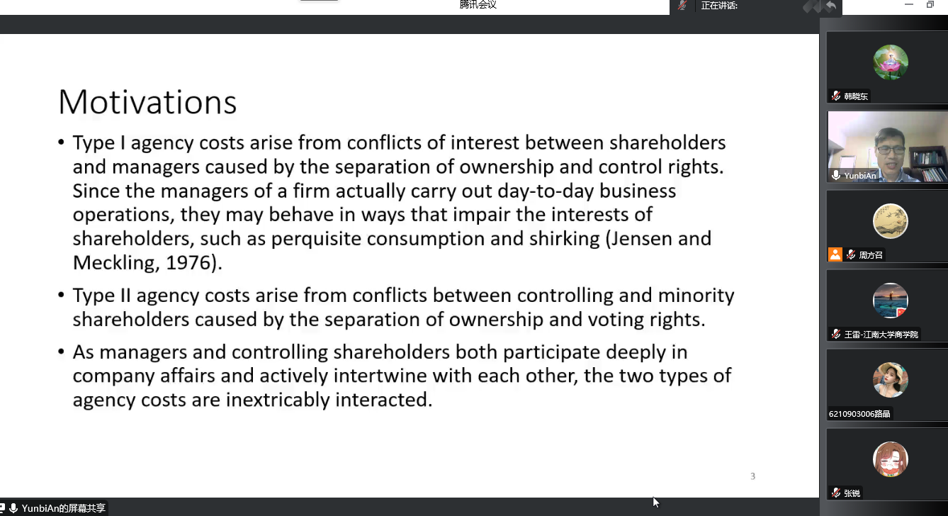 此次讲座,安教授首先介绍了研究动机:由于公司的经理人实际进行日常的经营活动,他们可能会以损害股东利益的方式行事,比如在职消费和推卸责任。控制权和投票权分离导致的控股股东和中小股东之间的冲突产生了代理成本。由于管理者和控股股东都深度参与公司事务,利益交织在一起,两类代理成本之间存在着千丝万缕的联系,由此引出了研究问题,即交互代理成本与企业价值波动。