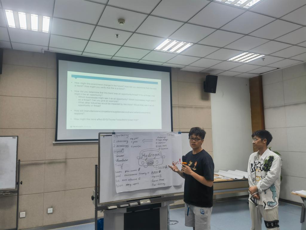 在课程中同学们也面临了许多的“难题”,例如拍摄十秒的视频展现什么是Marketing,又比如限时20分钟,小组活动中合作探索开放性论题的答案。其中最令人印象深刻的一场小组活动是要展示者以市场营销人的身份设计一套营销方案,并向其他同学推销。