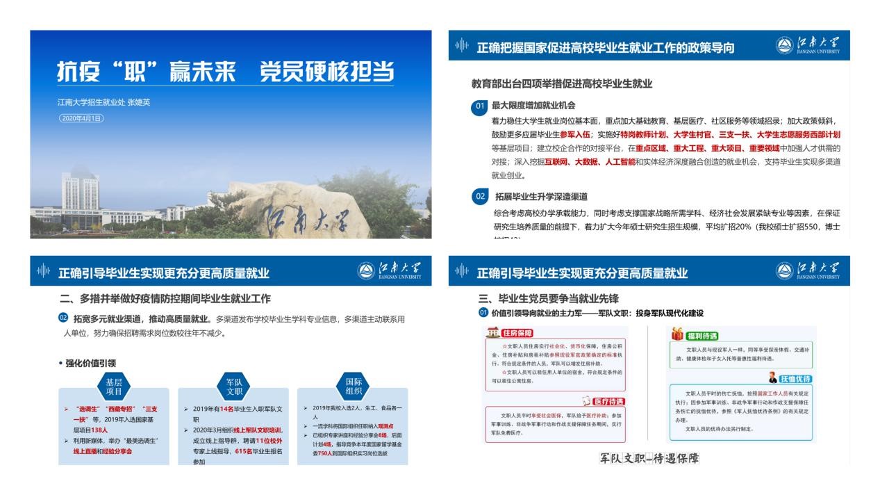 抗“疫”斗争中,青年一代挺身而出,担当奉献,扎根中国大地,谱写胸有大志、心有大我、肩有大任、行有大德的大写青春。张老师在此次云党课上对党员寄予了殷切的期望,希望毕业生党员走向国际舞台,发出江南声音,贡献中国智慧,参与全球治理体系改革和建设。“就业当前,党员在先”,学生党员应在率先垂范,解决就业的基础上,担当就业帮扶的示范生,靠前帮扶,主动作为,通过朋辈的力量让身边更多的同学尽早找到适合自己的职涯起点,让党旗在就业阵地上高高飘扬。