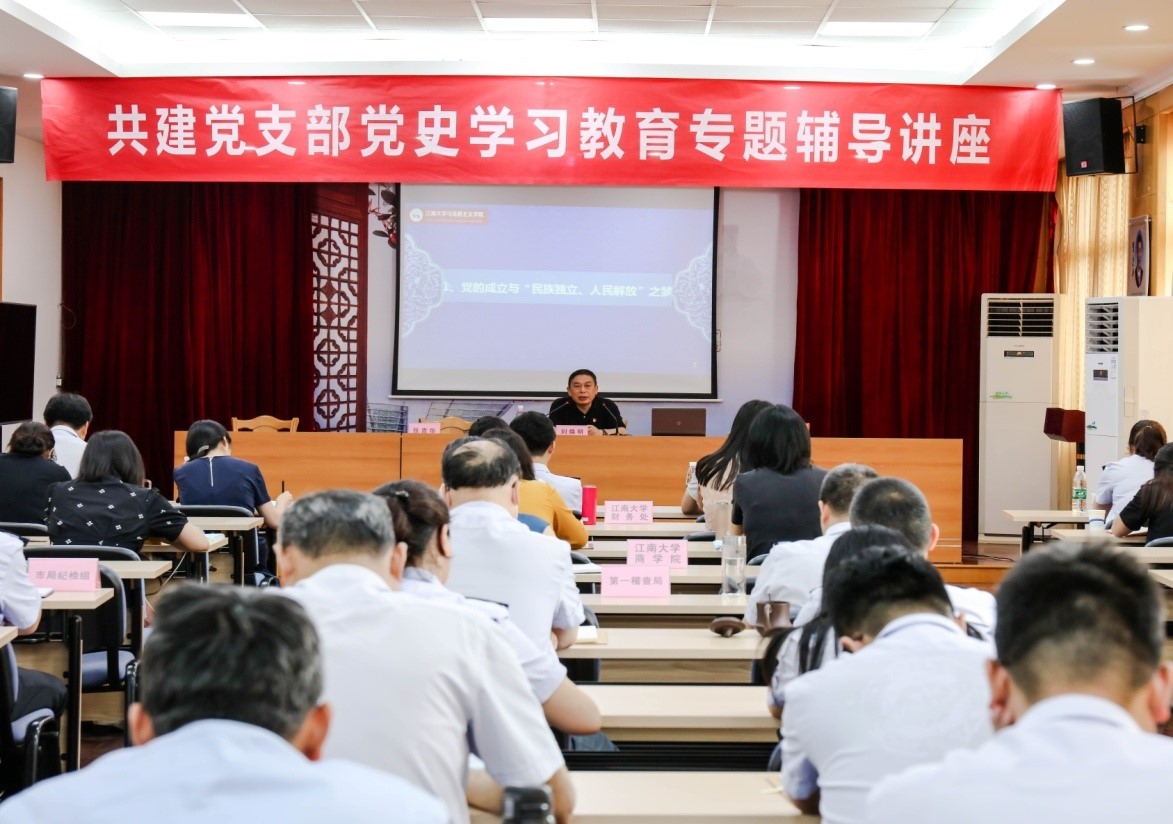 为深入推进党史学习教育,让党员干部进一步了解中国共产党100年的奋斗史,6月15日下午,beat365在线唯一官网工商管理教工党支部与无锡税务第一稽查局党支部、无锡税务纪检组党支部和beat365在线唯一官网财务处党支部联合开展党史学习教育。活动邀请到了党史学习教育省委、市委宣讲团成员、beat365在线唯一官网马克思主义学院院长刘焕明教授为共建支部作了题为《从胜利走向胜利的中国共产党》的百年党史专题辅导。