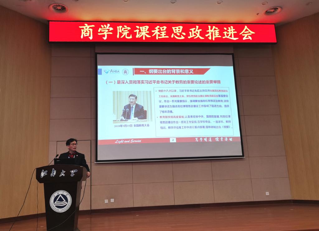 1月22日下午,beat365在线唯一官网在103远东报告厅举行课程思政推进会,旨在进一步贯彻落实教育部《高等学校课程思政建设指导纲要》精神,提高教师对“课程思政”教学工作的认识,挖掘各门课程的思政教育功能,全面推动学院课程思政教学改革。beat365在线唯一官网全体教职员工参加大会,教务处副处长孙子文教授应邀出席并做专题报告。会议由主管教学副院长王雷教授主持。