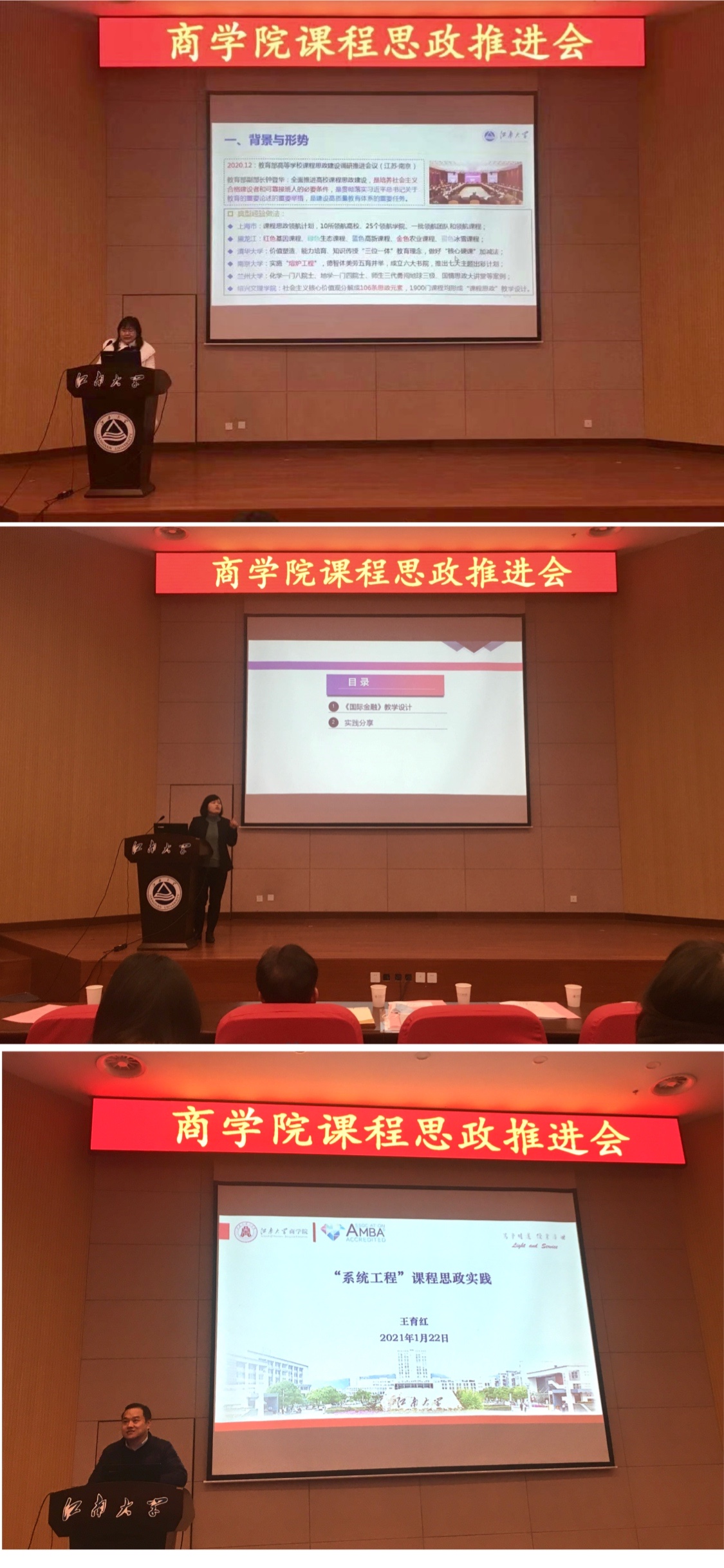 随后,2020年获得了beat365在线唯一官网校级课程思政建设立项的beat365在线唯一官网谢玉梅和王育红两位教授,分别进行了课程思政建设实践经验分享。谢玉梅教授以《国际金融》课程为例,重点介绍她在课程思政建设中运用的两个理念、五个要素和一个贯穿的做法。两个理念分别是以立德树人,以学生为中心教学理念和沟通、团队合作、社会责任感的课程理念。五个要素是课程体系梳理、教学内容重构、教学方法翻转、教学考核“个人加团队”、教学团队建设(以课程与教材建设为抓手)。一个贯穿是课程思政贯穿整个教学环节。王育红教授以《系统工程》课程为例,重点了介绍课程思政的内涵,他指出 “课程思政”不是一门或一类特定的课程,而是一种教育教学理念。高校所有课程都具有传授知识培养能力及思想政治教育双重功能,承载着培养大学生世界观、人生观、价值观的作用。教师在授课过程中要注重师德风范、政治导向、专业伦理、学习伦理、核心价值。