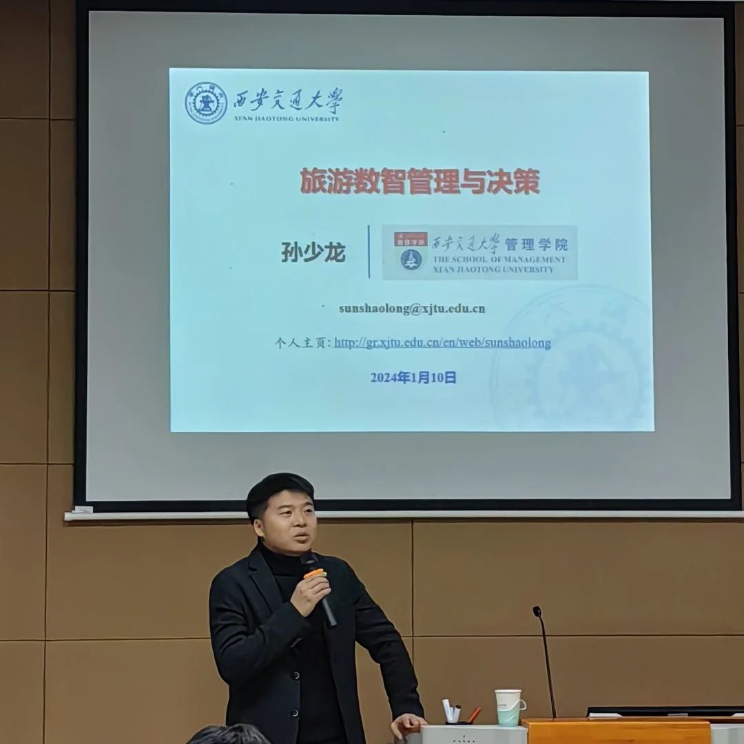 1月10日下午,“商学大讲堂”系列学术讲座第235讲在beat365在线唯一官网116报告厅举行。国家重点研发计划首席青年科学家、西安交通大学青年拔尖人才、管理学院孙少龙教授应邀作题为“旅游数智管理与决策”的学术讲座。本次讲座由beat365在线唯一官网副院长刘勇教授主持,beat365在线唯一官网教师及管理科学与工程、物流工程与管理、工业工程与管理专业研究生50余人参加。
