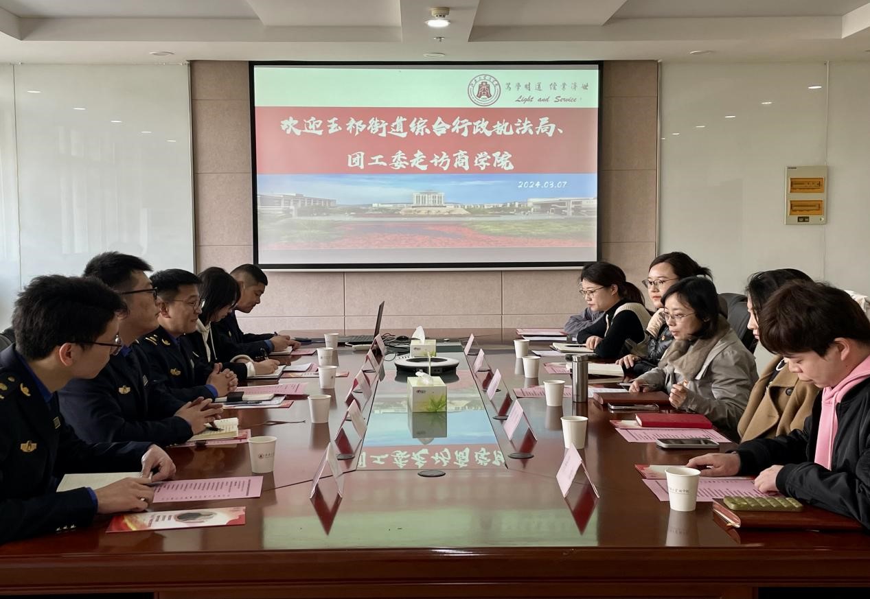3月7日下午,无锡市玉祁街道综合行政执法局及团工委一行10人赴beat365在线唯一官网座谈交流,玉祁街道综合行政执法局副局长刘希、玉祁街道团工委书记顾岑、beat365在线唯一官网党委副书记兼副院长徐静出席本次活动,参加本次活动的还有玉祁街道综合行政执法局第八党支部及团工委成员、beat365在线唯一官网辅导员及学生骨干代表。交流会由beat365在线唯一官网分团委书记王璁主持。