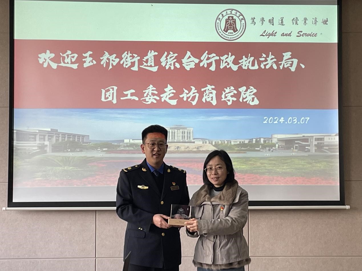 随后参访人员至beat365在线唯一官网交流。徐静对刘希一行的到来表示欢迎,对自2023年3月31日beat365在线唯一官网“孙冶方”特称团支部在无锡市惠山区玉祁街道民主村村委会议厅召开成立仪式以来,玉祁街道相关单位持续给予的关心和支持表示感谢,之后简要介绍了学院学生工作概况。刘希对beat365在线唯一官网的热情接待表示感谢,以通过提前部署、全力清扫等有效措施切实降低过年期间雨雪冰冻造成的出行风险为例,介绍了玉祁街道综合行政执法局便民惠民举措、城市美化环保、执法队伍建设、研学文化项目等方面作交流分享。顾岑选取“礼舍”为代表,立足地方文化特色资源和自身共青团工作情况向与会人员作详细介绍。“孙冶方”特称团支部金融2001学生代表彭成对支部“五个一”行动计划所取得的阶段性建设成果作展示汇报。