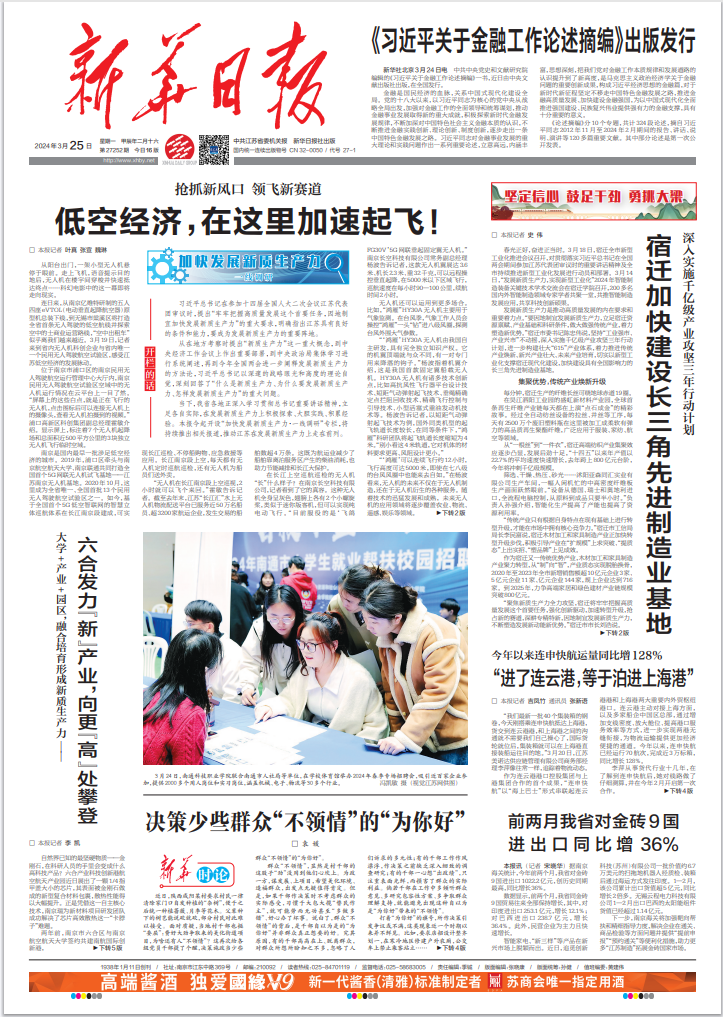 《新华日报》2024年3月25日头版“加快发展新质生产力·一线调研”专栏,刊登“低空经济,在这里加速起飞”文章,抢抓新风口,领飞新赛道。我院浦徐进教授接受《新华日报》专访并发表观点。