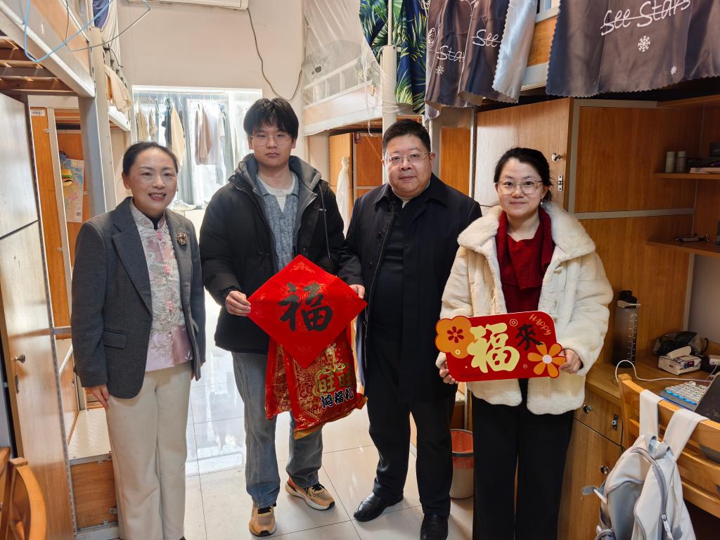 随后,慰问组依次走访了南区溪苑、淳苑,对留校学生和10名留学生进行慰问。走访教师深入了解中外学子的思想与生活状况,鼓励大家在就业与学习中展现“一马当先”的精气神。同时,学院领导老师现场排查宿舍安全隐患,叮嘱同学们严守学校安全管理规定,增强防火防盗防骗意识。