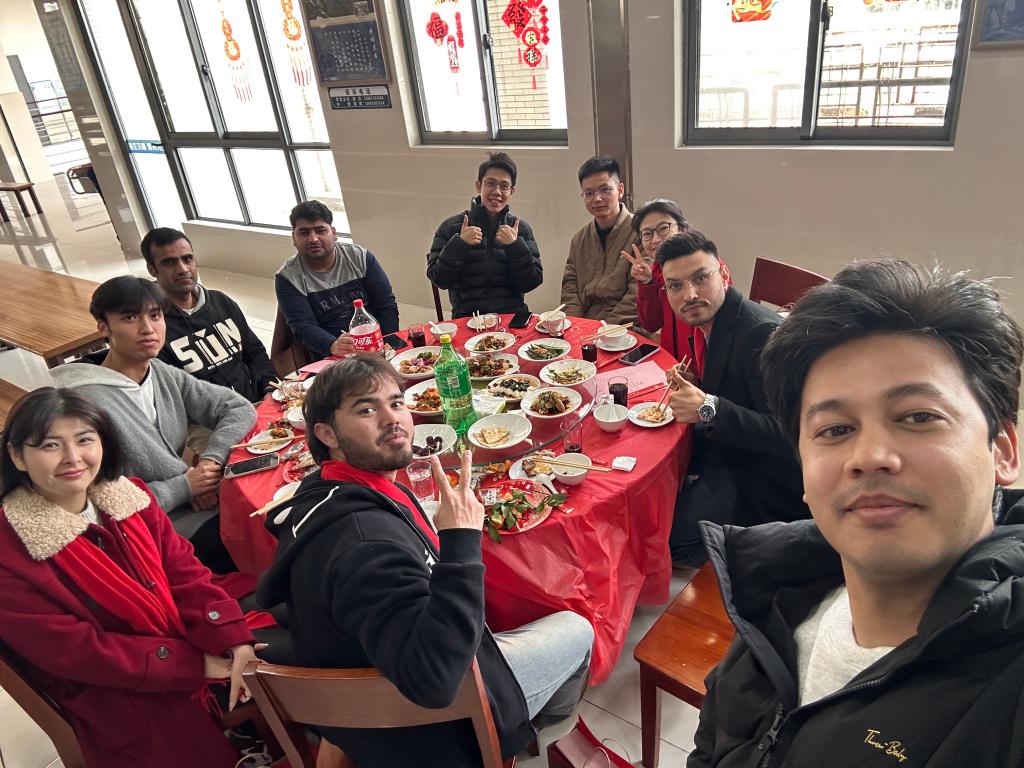 中午时分,校、院领导与留校学生同进年午饭,共话马年愿景。学院教师和留学生代表共同演唱歌曲《相亲相爱》,氛围亲切融洽。师生们举杯同庆,互送祝福,合影留念,用镜头定格了一张张灿烂的笑脸与温情瞬间。