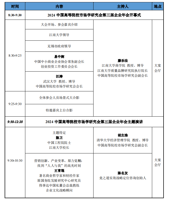 当今世界正处于众多未知之大变局中,从宏观层面看,全球经济仍然面临着地缘政治形势紧张、贸易保护主义抬头、逆全球化风险加剧、供应链脱钩断链带来的严峻挑战。从微观层面看,企业自身发展除了面临着日渐激烈的市场竞争压力,还亟需应对新技术、新模式催生的高度不确定性、非线性、不可知、不可控的市场环境。在宏观变局和微观张力的双重作用下,很多企业内卷加剧,出口受限,战略方向易迷失,找不到有效的增长路径,面临着新媒体难运营、新品类难开创、新渠道难开拓、数字化难落地、战术性增长难持续等问题。针对当前业界面临的机遇和挑战,2024 企业年会将以“学界与业界:营销创新 产业变革”为主题,聚合全国市场营销业界精英和顶级学者力量,面向产业界关切的问题,共研新形势下营销创新发展之道。作为国家一级学会,我们既是学术规则、商业规则、行政规则的翻译者、传播者,又是中国企业市场营销创新生态的探索者、驱动者、营造者。面向产业、面向市场、面向未来,我们汇聚全国力量,共建中国企业市场营销创新体系,丰富中国市场营销新实践新思想。这将是一场超高知识密度、极具启发性的思想风暴大会,帮助企业了解最前沿营销理论和营销手段。这同样是一场集聚国内高能级市场营销首脑的盛会,为业界精英和专家学者创造面对面互动和分享的机会,探讨营销创新与产业变革的前沿议题,促进学界与业界的深度融合与协同发展。