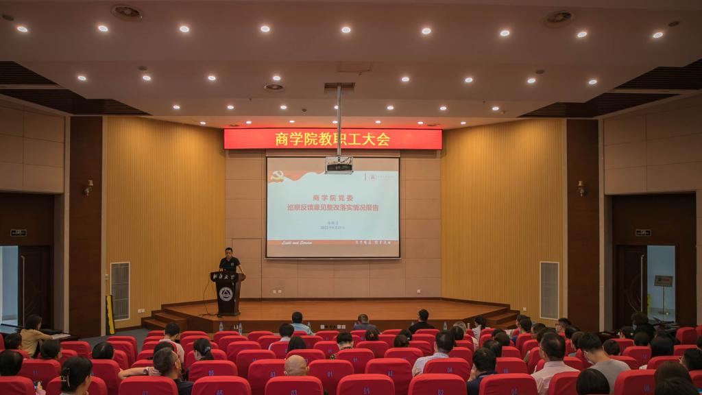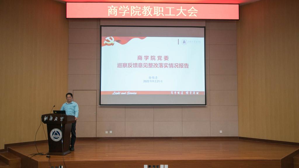 随后,院长浦徐进传达了学校新学期工作部署会的精神。2022年是学校实施新一轮“双一流”建设的开局之年,也是学校落实“十四五”规划的关键之年。学校以谋划实施“奋进计划”为重点,聚力推动“双一流”建设,统筹抓好常态化疫情防控和改革发展稳定工作,稳步推进学校各项事业高质量发展。浦徐进围绕教师节活动、学科建设、本硕教学、科学研究、学生工作、专业学位建设、AACSB认证、国际教育、市校合作、环境空间改造等十大板块内容回顾了学院暑期主要工作。浦徐进指出,今年是第七轮任期目标的收官之年,下半年将迎来党的二十大胜利召开,学院将重点围绕学习宣传贯彻党的二十大精神,结合第七轮任期目标考核稳步推进学院发展各项工作。学院将成立发展战略咨询委员会,推动与无锡市的深度合作;探索本科专业更新迭代,优化“尚学质量工程计划”;筹备召开人才工作会议,加快人才引培进程。同时,学院将通过组织2023年国家级项目申报、联合举办研究生学术论坛,进一步助力学院科学研究高质量发展。
