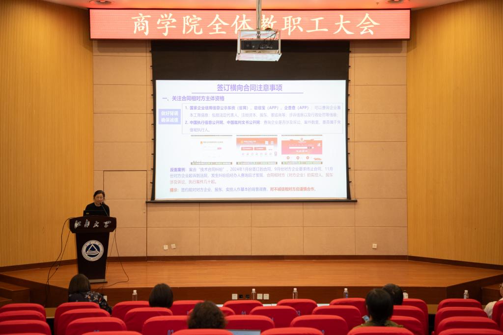 会议最后,校产业技术研究院综合科科长薛华茂带来横向科研工作交流汇报,围绕横向科研合同签订、制度规范、政策解读以及科技服务警示案例等内容进行了全面细致讲解。此次交流为学院教师开展横向科研工作提供了专业指导,助力学院教师进一步规范使用科研经费、提升科研服务社会能力。