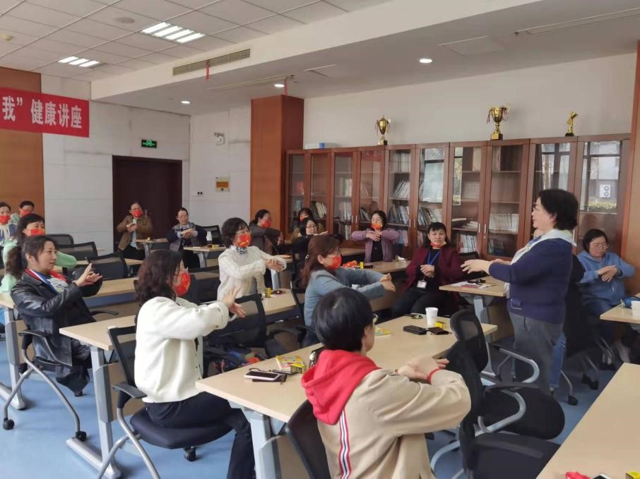丁主任讲座后,我院国贸系朱未萍老师结合自身实践,和老师们互动分享了有关针灸保健的个人心得与体会。朱老师用“头颈寻列缺、面口合谷收、心胸内关谋、肚腹三里留、腰背委中求”五句话为大家生动阐释了中医针灸养生的内涵,并指导大家一一实践,让女教师们争相探讨,相互交流,收获满满。