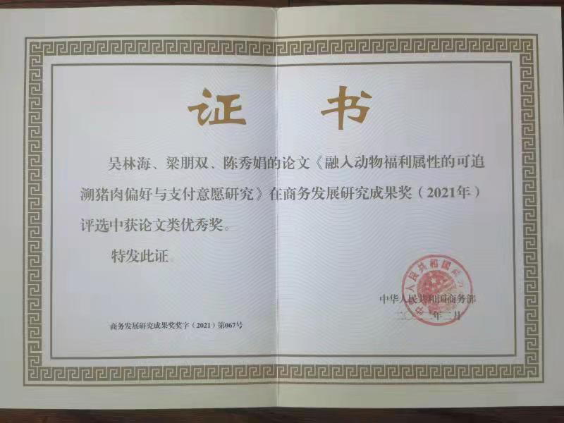近日,我院在商务发展研究成果奖项方面传来佳讯。浦徐进教授的专著《供应链模式创新:线上线下融合之路》获得国家商务部商务发展研究成果奖(2021)论著类二等奖;吴林海教授的论文“融入动物福利属性的可追溯猪肉偏好与支付意愿研究”获论文类优秀奖