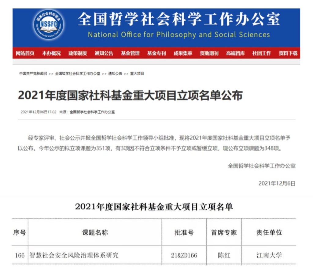 2021年12月6日,全国哲学社会科学工作办公室正式公布了2021年度国家社会科学基金重大项目立项名单,beat365在线唯一官网国家安全与绿色发展研究院院长陈红教授作为首席专家申报的“智慧社会安全风险治理体系研究”获得立项,项目批准号(21&ZD166)。这是陈红教授主持的第2个国家社会科学基金重大项目。