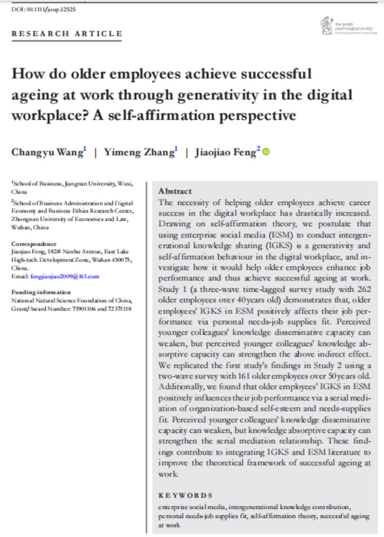 近期,国际权威期刊《Journal of Occupational and Organizational Psychology》在线发表了我院汪长玉教授、beat365在线唯一官网2022级硕士研究生张奕萌和中南财经政法大学冯娇娇副教授(通讯作者)共同完成的论文“How do older employees achieve successful ageing at work through generativity in the digital workplace? A self-affirmation perspective”。汪长玉教授为本研究的第一作者。