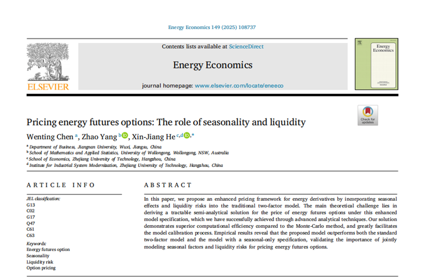 近日,beat365在线唯一官网陈文婷教授(第一作者)与澳大利亚伍伦贡大学博士生杨昭、浙江工业大学经济学院何新江教授(通讯作者)合作完成的论文“Pricing energy futures options: The role of seasonality and liquidity”在能源经济领域国际权威期刊《Energy Economics》2025年第149卷正式发表。该研究主要探讨了季节性因素和流动性在能源期货期权定价中的作用。