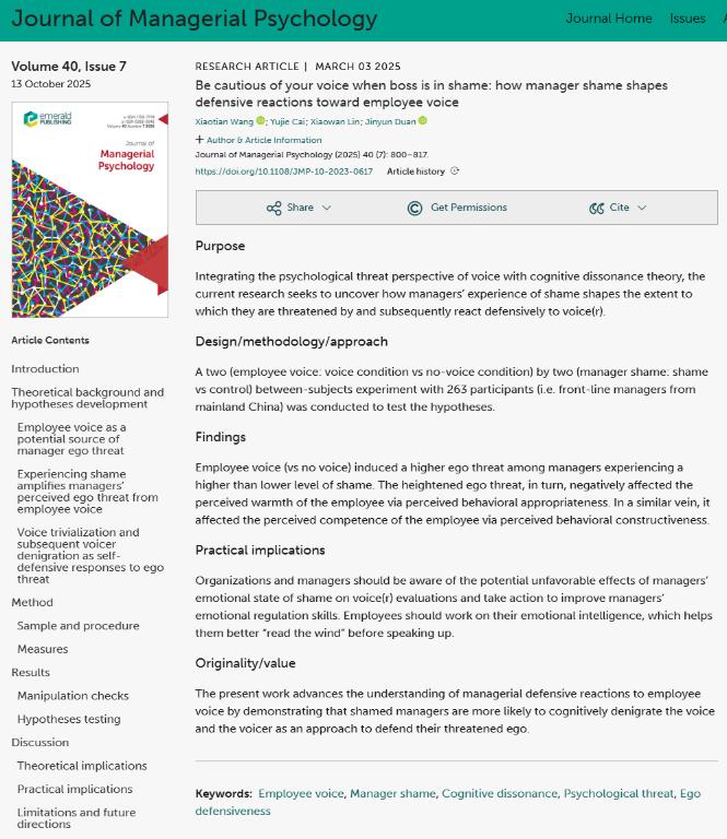 近期,我院王啸天老师作为第一作者与合作者共同完成的论文“Be cautious of your voice when boss is in shame: How manager shame shapes defensive reactions toward employee voice”在《Journal of Managerial Psychology》正式刊发。该研究揭示了管理者羞耻情绪如何影响其对员工建言行为的防御性反应,为理解与管理组织中的建言互动提供了重要启示。