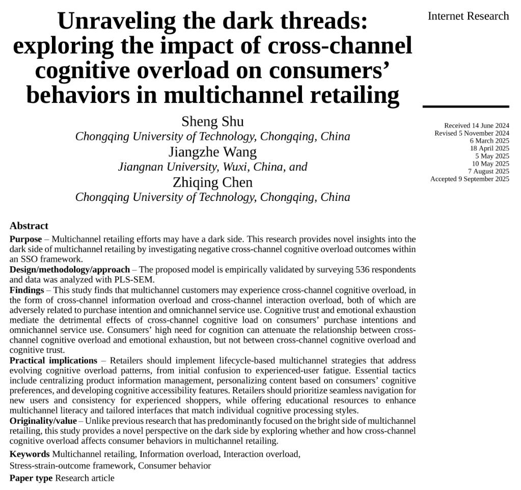 该研究聚焦于多渠道零售中被忽视的“阴暗面”,利用“压力-紧张-结果”(SSO)框架系统构建了跨渠道信息超载与互动超载对消费者行为的影响路径。通过实证分析,研究发现上述认知超载会通过降低认知信任并引发情感耗竭,最终显著削弱消费者的购买意愿及全渠道服务的使用意向。此外,研究还探讨了消费者个人认知需求在调节认知压力与心理耗竭之间的边界作用,为理解高度互联环境下的多渠道消费者行为提供了新视角。