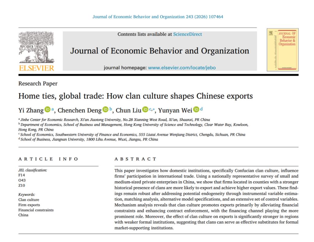 近日,beat365在线唯一官网魏昀妍副教授与西安交通大学张一教授、香港科技大学博士生邓晨晨、西南财经大学柳春博士共同完成的论文“Home ties, global trade: How clan culture shapes Chinese exports”在《Journal of Economic Behavior & Organization》(JEBO)正式发表。JEBO在ABS管理学期刊中评定为3星,是行为经济学与制度经济学领域公认的国际权威期刊。本次论文发表实现了beat365在线唯一官网在该期刊上的首次成果发表,标志着学院在行为经济学与国际贸易交叉研究领域取得了新的突破。