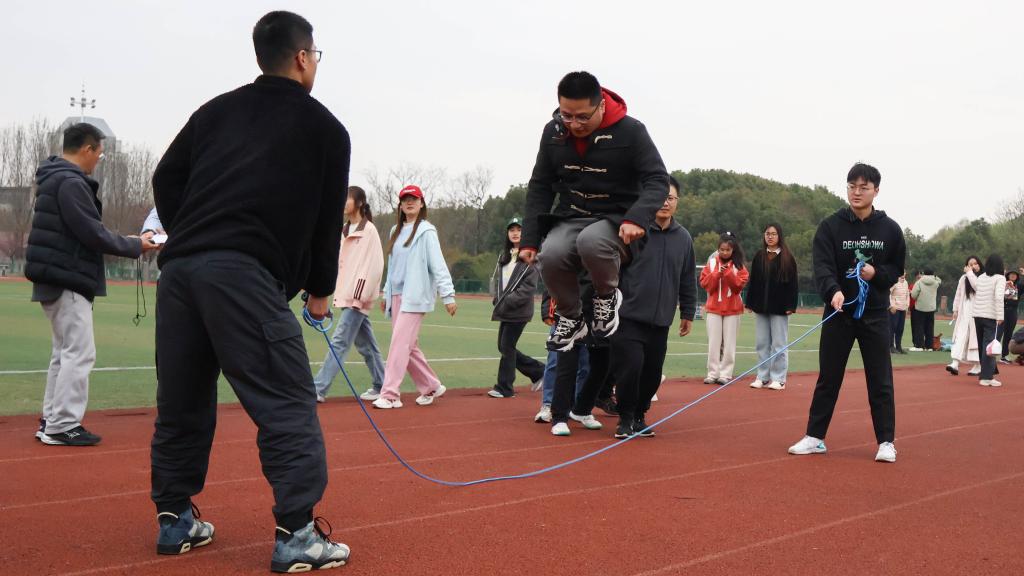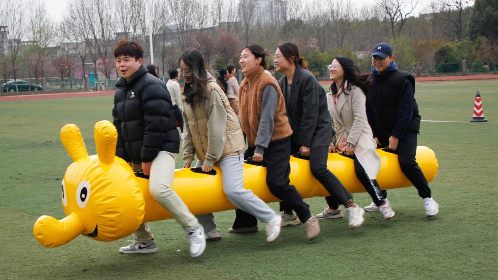 毛毛虫竞速是本次比赛的看点之一,团队成员们必须保持同样的步速和步伐来使队伍的“坐骑“迅速地完成移动,各参赛成员齐喊口号、全力前进,观看教职工加油助威、热情洋溢。随后,每支队伍派出10名代表参加团队跳绳项目。随着绳子上下摇摆,团队成员们默契配合,随着绳子的节奏快速穿梭,每个人都全情投入,享受着运动的快乐。