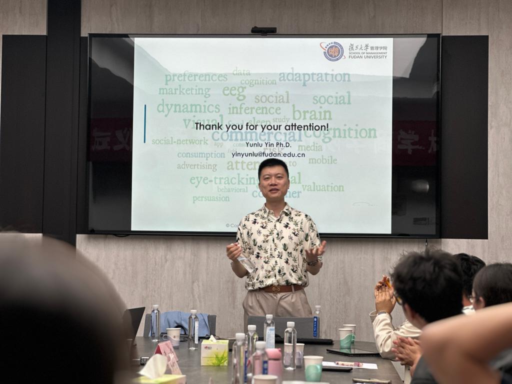 殷云露老师首先介绍了自己的研究领域以及常用的研究工具,比如实验室实验、田野实验、眼动跟踪、脑电图、功能磁共振成像、二手数据、VR等,并回顾了他以往在人机互动、虚拟现实、虚拟营销、神经认知等方面的研究。之后,殷云露老师从分配公平、社会存在、自发心理化、世俗信念等概念出发,阐述了文章的研究假设和模型,并详细讲解了眼动实验以及现场实验的内容和结果。研究发现拟人机器人的存在会增加人们对效率(vs. 公平)的偏好,因此管理者和政策制定者应该注意AI可能对人类道德决策产生的不经意的后果,特别是在涉及社会福利或法律后果的情境中。
