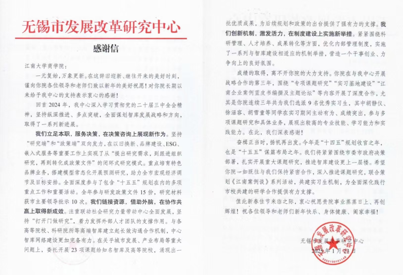 1月13日,无锡市发展改革研究中心特向我院发来感谢信,对学院为服务地方经济高质量发展提供的智力支持和人才支撑,予以高度肯定和衷心感谢,并向我院全体教职工致以新春祝福。