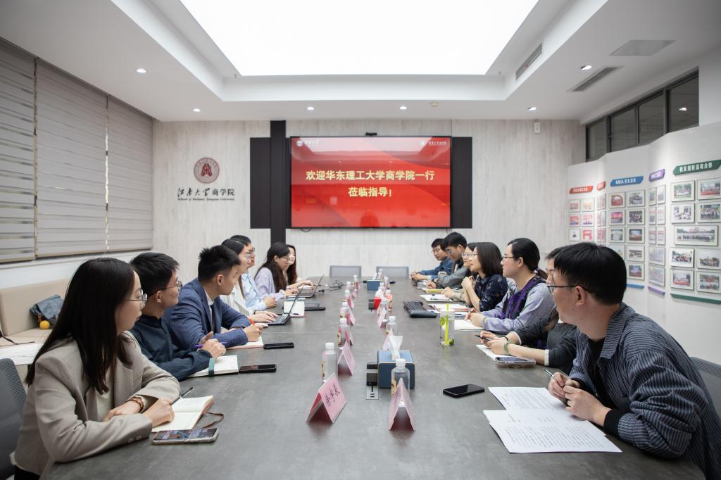 孙小芳代表学院对华东理工大学beat365在线唯一官网一行的到来表示热烈欢迎,并以“根植江南工商文化 汇聚协同育人力量——系统构建‘立德树人’育人共同体新生态”为主题,从学院整体概况、思政教育、学风建设、就业工作、安全稳定五方面,介绍beat365在线唯一官网学生工作重点及思考。