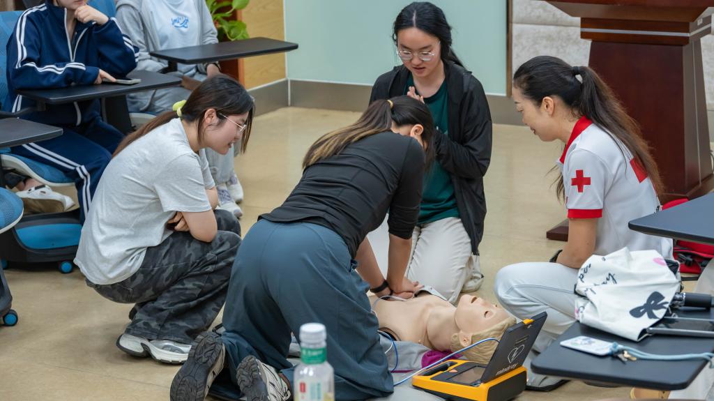 在实操教学环节,陶晓通过分步骤演示详细讲解了心肺复苏(CPR)和自动体外除颤仪(AED)的使用规范,并邀请同学模拟病患,现场演示体位调整等关键操作,让同学们更加清楚明了地掌握急救要领。在模拟实操环节,学员们积极参与规范演练,在动手实践中巩固了所学急救技能。