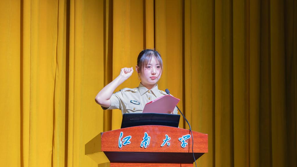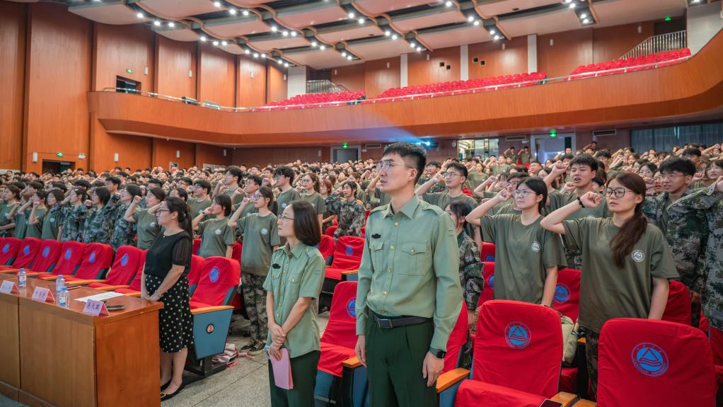 在她的带领下,581名参训新生高举右拳,庄严宣誓。铿锵有力的誓言回荡在会场,表达了同学们不畏艰难、圆满完成军训任务的坚定决心和必胜信念。