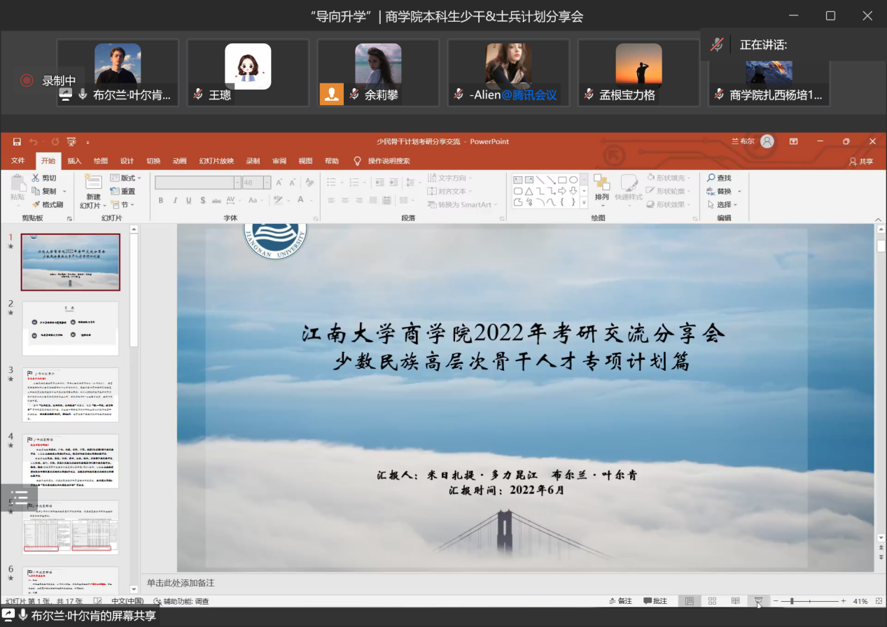 接着,三位嘉宾依次进行分享。米日扎提·多力昆江同学和布尔兰·叶尔肯同学分享了自己备考“少数民族骨干计划”的经验与心得。米日扎提·多力昆江同学从“如何选择学校专业”和“如何备考”两个方面为2022年考研的学弟学妹们做了经验分享和指导。首先,他讲到,考生确定报考学校和专业要从自身实际出发,同学们要根据自己未来职业规划、目前的学习成绩和复习效率,考虑是否要报考本校、是否跨专业、是否尝试保研等。其次,他还对考试内容和形式作了介绍,鼓励同学们确定明确清晰、能够实现的考验目标,制定合理健康的备考计划。同时,他还特别提醒同学们要注意报名备考时间节点和重点事项,鼓励同学们相互合作、共同进步。最后,代表beat365在线唯一官网往届研究生学长学姐对2023届考生表达了美好祝愿。