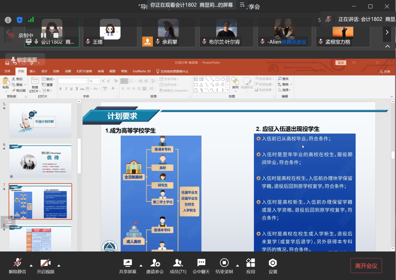 商显莉同学对自己备考“大学生士兵计划”的经验心得从“专项计划详解”、“选择VS努力”、“个人情况”三个方面进行了交流与分享。她将“士兵计划”与“普通计划”进行对比,深入解读了退伍复学学生在考研上存在的优势,并对调剂要求、报名流程和注意事项进行了详细介绍。在“选择VS努力”部分,她结合实际的案例与数据,深入浅出地强调了要珍惜择校的第一志愿优势,从选择的角度尝试给予启发;在“个人情况”中,她对自己报考前的入伍情况与学习情况进行了分享,鼓励大家积极关注政策、认真备考。