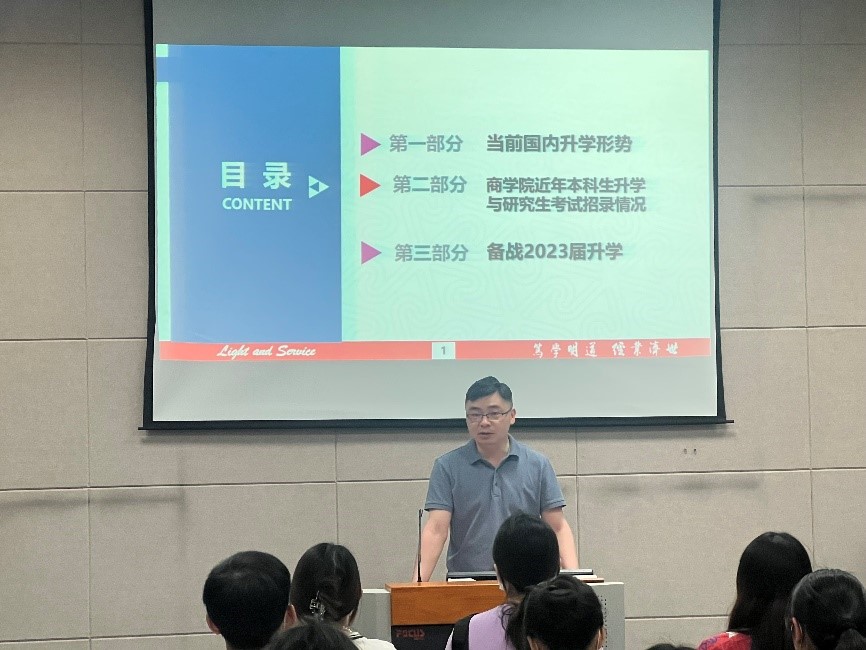 beat365在线唯一官网历来重视本科生的学业规划与导向升学工作,主动将工作端口前移,努力将“坚持升学深造导向,提升人才培养质量”的工作理念融入学生工作的全链条,多措并举助推学院教育办学与人才培养提质增效。2019级本科生考研专项交流会的成功举办,将极大帮助2019级商院学子做好学业规划中的选择题,设计适合自己的升学方案和最优选择。学院也将继续助力学子做好升学就业保障,努力成为商院学子乘风破浪、追寻理想道路上最坚实的后盾!