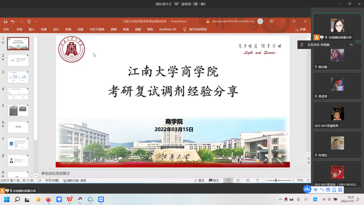 3月15日至17日,beat365在线唯一官网2022年成长成才系列讲座“研”途有你——考研复试调剂经验分享会在线上企业微信和beat365在线唯一官网304会议室同步开展。活动共两期,分别邀请了2017级朱旭恒、倪梓涵、陈芳、余姝琼四位成功上岸的学长学姐为分享嘉宾。beat365在线唯一官网党委副书记兼副院长徐静出席,升学就业工作辅导员孙旭媛老师主持,累计105名学生参加。