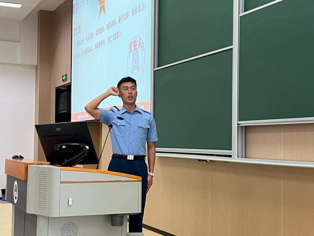 李子涵作为退伍老兵向新生们分享他的入伍初心和军旅经历,他鼓励同学们,军训的过程固然艰苦,但只要有破釜沉舟、不破不立的决心,再艰苦的任务,也可以圆满的完成。最后他带领全体参训学生庄严宣誓。