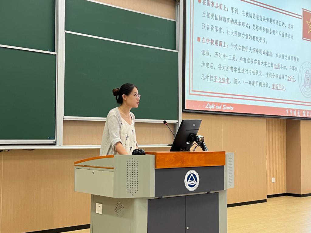 田雨作军训安排及安全教育介绍,她围绕军训作息时间、军容风纪、每日生活制度、请销假规定、考核标准等方面向新生们普及军训相关知识,引导学生在思想上清晰认识、在行动上高度落实,确保圆满完成既定任务。