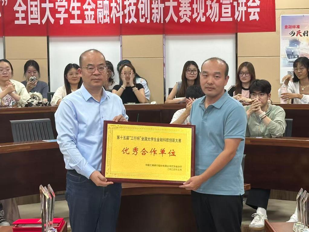 丁珮瑾与刘勇共同为第十五届“工行杯”全国大学生金融科技创新大赛江苏省赛获奖学生代表颁奖。beat365在线唯一官网学子荣获江苏省级一等奖1项、省级二等奖2项、省级三等奖4项的佳绩。获奖代表上台领奖时,现场掌声不断,充分展现了beat365在线唯一官网学子在金融科技创新领域的优异成果。