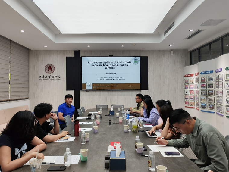 5月13日,数智组织与智融创新研究团队第三期学术活动在beat365在线唯一官网109会议室举行。韩国釜山大学beat365在线唯一官网牟健教授受邀作题为《人工智能聊天机器人的拟人化对用户持续使用在线健康咨询服务的影响关系研究》的学术讲座。本次讲座由beat365在线唯一官网组织管理系主任汪长玉教授主持,学院教师和各专业研究生共计20余人参加讲座。